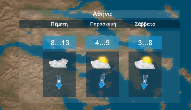 Στην Αθήνα προβλέπονται τοπικές νεφώσεις . Η θερμοκρασία την Παρασκευή και το Σάββατο θα πέσει στους 8 με 9 βαθμούς Κελσίου.