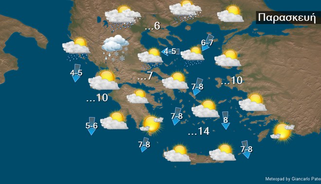 Λίγες νεφώσεις που γρήγορα στα βόρεια και βαθμιαία στην υπόλοιπη χώρα θα αυξηθούν και θα σημειωθούν τοπικές βροχές κυρίως στα ανατολικά ηπειρωτικά. Χιόνια θα πέσουν στα βόρεια ορεινά και από τη νύχτα και στα υπόλοιπα ηπειρωτικά ορεινά καθώς και σε ημιορεινές περιοχές της βόρειας Ελλάδας. Η ορατότητα στα δυτικά ηπειρωτικά θα είναι τις πρωινές ώρες τοπικά περιορισμένη. Οι άνεμοι θα πνέουν δυτικοί βορειοδυτικοί 3 με 4 και στα νότια 5 με 6 μποφόρ, γρήγορα όμως στα βορειοανατολικά και σταδιακά στα υπόλοιπα ανατολικά θα στραφούν σε βορειοανατολικούς 4 με 6 και στο βόρειο Αιγαίο τοπικά 7 μποφόρ.