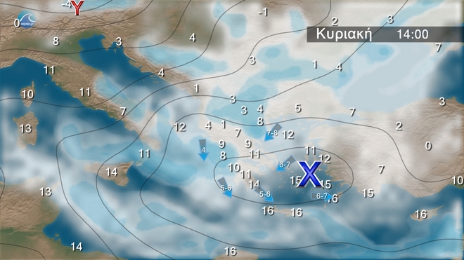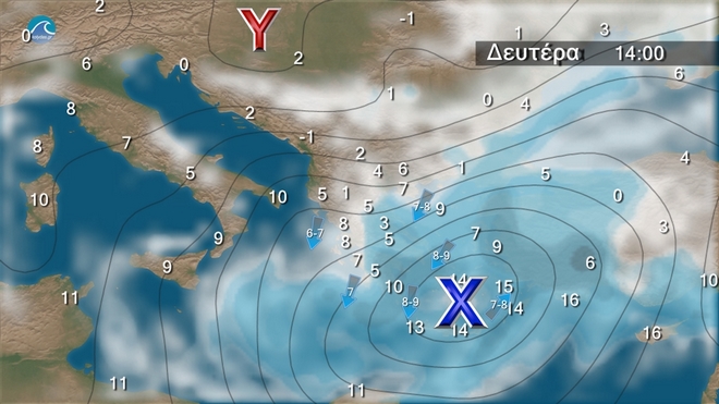 Νεφώσεις με βροχές και χιονοπτώσεις κατά διαστήματα πυκνές στα ορεινά, στα ημιορεινά της κεντρικής και βόρειας χώρας καθώς και σε περιοχές με χαμηλότερο υψόμετρο στη Θεσσαλία, την Ανατολική Στερεά και πρόσκαιρα στη βόρεια Ελλάδα. Καταιγίδες στα νότια θαλάσσια και παραθαλάσσια. Οι άνεμοι θα πνέουν στα δυτικά βορειοανατολικοί 6 με 7 μποφόρ. Στα ανατολικά βορειοανατολικοί 6 με 7 και στο Αιγαίο 8 με 9 μποφόρ, στο νοτιοανατολικό Αιγαίο θα πνέουν από νότιες διευθύνσεις 5 με 7 μποφόρ. Η θερμοκρασία θα σημειώσει πτώση σε όλη τη χώρα. Παγετός θα σημειωθεί κατά τόπους στα ηπειρωτικά, κυρίως κεντρικά και βόρεια.