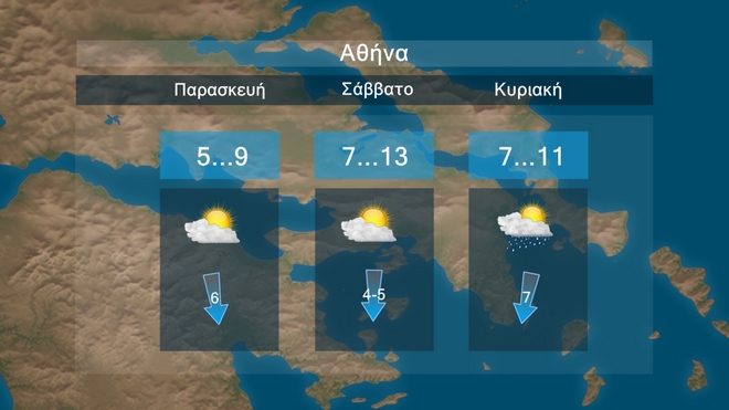 Τοπικές νεφώσεις παροδικά αυξημένες στην Αθήνα. Η θερμοκρασία θα έχει μέγιστες τιμές περί τους 9 και το Σάββατο τους 13 βαθμούς Κελσίου.