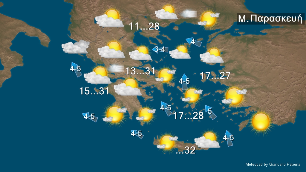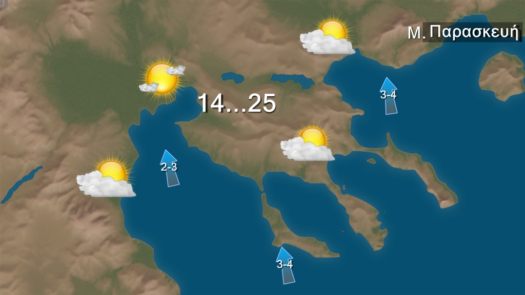 Τη Μεγάλη Παρασκευή προβλέπεται γενικά αίθριος καιρός με αραιές νεφώσεις από το απόγευμα κυρίως στα δυτικά. Η ορατότητα τις πρωινές ώρες στα κεντρικά και βόρεια ηπειρωτικά θα είναι τοπικά περιορισμένη. Οι συγκεντρώσεις αφρικανικής σκόνης στην ατμόσφαιρα θα είναι αυξημένες. Οι άνεμοι θα πνέουν στο Ιόνιο νοτιοανατολικοί 3 με 5 μποφόρ. Στις υπόλοιπες περιοχές μεταβλητοί 2 με 4 και από το απόγευμα στο Αιγαίο νότιοι 3 με 5 μποφόρ. Η θερμοκρασία θα κυμανθεί σε επίπεδα υψηλότερα από τα κανονικά για την εποχή, φτάνοντας σε αρκετές περιοχές τους 28 με 31 βαθμούς Κελσίου.