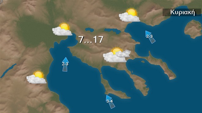 Σήμερα Κυριακή σε όλη τη χώρα προβλέπονται αραιές νεφώσεις κατά τόπους πιο πυκνές , αρχικά στα δυτικά και τα βόρεια και βαθμιαία και στις υπόλοιπες περιοχές με ασθενείς τοπικές βροχές στα δυτικά. Η ορατότητα τις πρωινές και βραδινές ώρες θα είναι κατά τόπους περιορισμένη. Οι άνεμοι θα πνέουν νοτιοδυτικοί 3 με 5, στα πελάγη τοπικά 6 και στο Αιγαίο πρόσκαιρα έως 7 μποφόρ. Η θερμοκρασία δεν θα σημειώσει αξιόλογη μεταβολή και θα φτάσει τους 17 με 18 και κατά τόπους στα κεντρικά και νότια τους 19 με 20 βαθμούς Κελσίου.