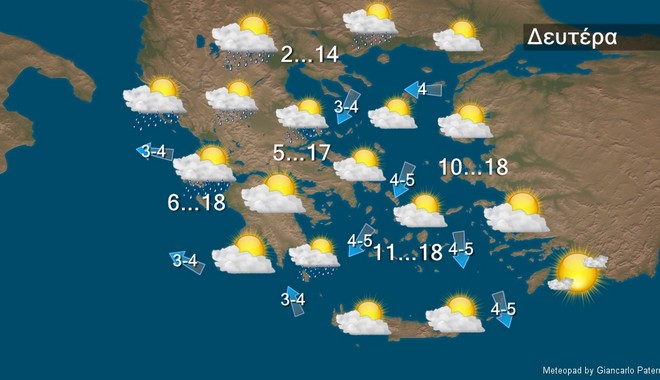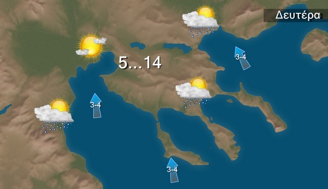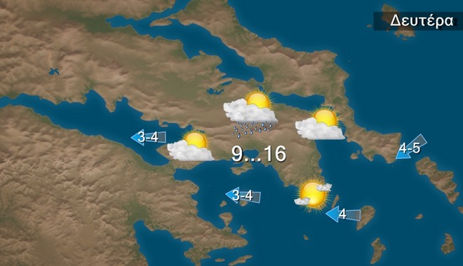 Τη Δευτέρα τοπικές βροχές αρχικά στα δυτικά και από το απόγευμα στα κεντρικά και τα νότια. Η ορατότητα τις πρωινές ώρες στα ηπειρωτικά, στις Σποράδες, και το βόρειο Αιγαίο θα είναι κατά τόπους περιορισμένη. Ευνοείται η μεταφορά αφρικανικής σκόνης στα νότια. Οι άνεμοι θα πνέουν από ανατολικές διευθύνσεις 3 με 5 μποφόρ και μόνο στα Δωδεκάνησα θα πνέουν βορειοδυτικοί, το πρωί τοπικά έως 6 μποφόρ.