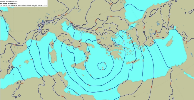 Προγνωστικός χάρτης επιφανείας με την θέση του βαρομετρικού χαμηλού στο Νότιο Ιόνιο το μεσημέρι της Παρασκευής 25/1/1019
