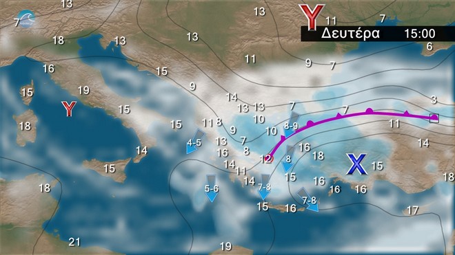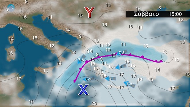 Στην Κρήτη, τις Κυκλάδες και τα Δωδεκάνησα παροδικές νεφώσεις και, κυρίως από το μεσημέρι, σποραδικές βροχές. Στην υπόλοιπη χώρα βροχές και καταιγίδες, τα φαινόμενα ενδέχεται να είναι κατά τόπους ισχυρά κυρίως στα ανατολικά ηπειρωτικά, την Εύβοια, τις Σποράδες και από το βράδυ στα νησιά του βόρειου και ανατολικού Αιγαίου. Χιονοπτώσεις θα σημειωθούν στα κεντρικά και βόρεια ορεινά. Οι άνεμοι θα πνέουν στα νοτιοανατολικά, νοτιοανατολικοί 6 με 8 μποφόρ, στις υπόλοιπες περιοχές βόρειοι βορειοανατολικοί 6 με 8 και από το βράδυ στο βόρειο Αιγαίο 9 μποφόρ. Η θερμοκρασία δεν θα σημειώσει αξιόλογη μεταβολή.