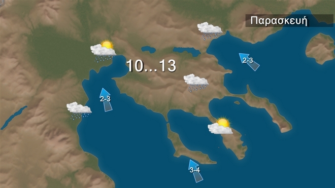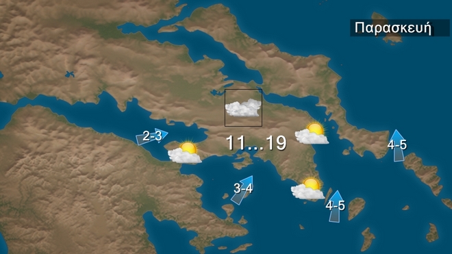 Την Παρασκευή στα δυτικά, τα βόρεια και τα νησιά του ανατολικού Αιγαίου προβλέπονται τοπικές βροχές και κυρίως στα βορειοδυτικά, σποραδικές καταιγίδες. Στην υπόλοιπη χώρα θα υπάρχουν λίγες νεφώσεις κατά περιόδους αυξημένες.