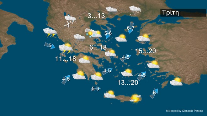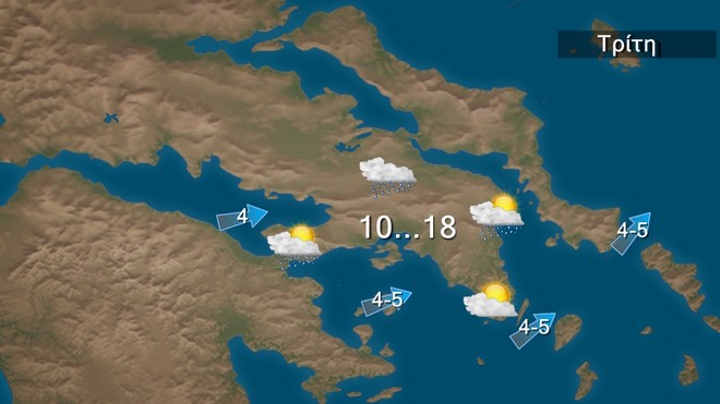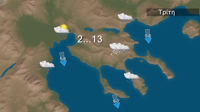Την Τρίτη αρχικά στα δυτικά και βόρεια και βαθμιαία στα κεντρικά, ο καιρός θα παρουσιάσει μεταβολή με κύρια χαρακτηριστικά, τις τοπικές βροχές, τις σποραδικές καταιγίδες, τους ενισχυμένους βοριάδες στο βόρειο Αιγαίο, την πτώση της θερμοκρασίας και τις χιονοπτώσεις στα κεντρικά και βόρεια ηπειρωτικά ορεινά και ημιορεινά οι οποίες από τη νύχτα στα βόρεια θα ενταθούν. Η θερμοκρασία θα σημειώσει πτώση και θα κυμανθεί στα βόρεια από 3 έως 13 βαθμούς, ενώ στα βορειοδυτικά η ελάχιστη θα πέσει περί τους -4 βαθμούς. Στα υπόλοιπα ηπειρωτικά και το Ιόνιο ο υδράργυρος θα φτάσει τους 18 βαθμούς και στα νησιά του Αιγαίου τους 20 βαθμούς Κελσίου.
