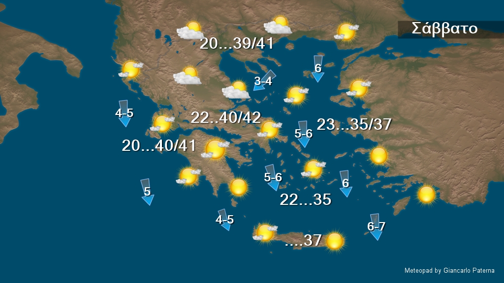 Το Σάββατο προβλέπεται γενικά αίθριος καιρός, με τοπικές νεφώσεις στα ηπειρωτικά τις μεσημβρινές και τις απογευματινές ώρες. Οι άνεμοι θα πνέουν από βόρειες διευθύνσεις 3 με 5 και στο Αιγαίο 6 και πρόσκαιρα τις θερμές ώρες της ημέρας 7 μποφόρ. Η θερμοκρασία θα σημειώσει μικρή άνοδο και οι μέγιστες τιμές της θα κυμανθούν στα ηπειρωτικά περί τους 39 με 40 βαθμούς, ενώ λόγω τοπικών συνθηκών (μικροκλίμα, καταβάτες άνεμοι) και ειδικότερα σε περιοχές στο εσωτερικό της ηπειρωτικής χώρας που δεν επηρεάζονται από θαλάσσιες αύρες η θερμοκρασία θα φθάσει τους 41 με 42 βαθμούς Κελσίου. Πιο συγκεκριμένα θα επηρεαστούν περιοχές της κεντρικής Μακεδονίας, της Θεσσαλίας, της Στερεάς και της Πελοποννήσου. Στα νησιά του Ιονίου, τα Δωδεκάνησα και τη νότια Κρήτη θα φθάσει τους 35 με 37 βαθμούς, ενώ στην υπόλοιπη νησιωτική χώρα τους 33 με 35 βαθμούς Κελσίου.