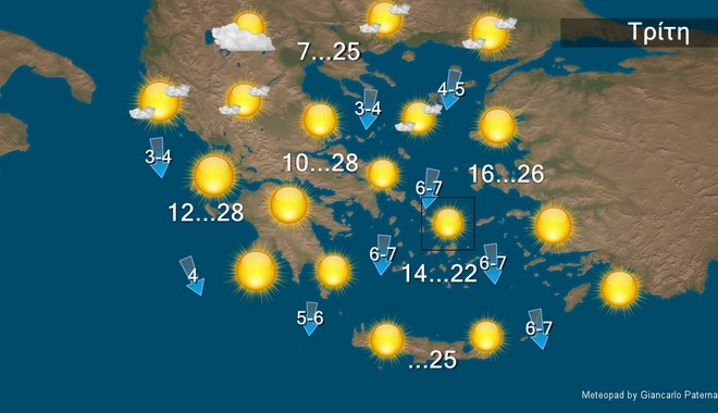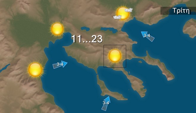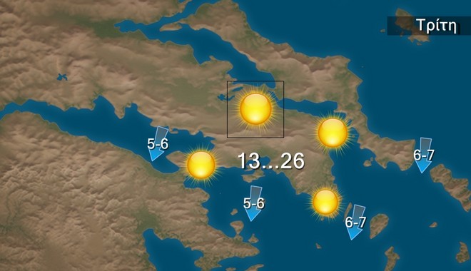 Την Τρίτη προβλέπεται γενικά αίθριος καιρός και μόνο στα βόρεια θα υπάρχουν λίγες νεφώσεις. Οι άνεμοι θα πνέουν στα δυτικά βορειοδυτικοί 3 με 4 μποφόρ, στα ανατολικά 4 με 6 και στο Αιγαίο τοπικά 6 με 7 μποφόρ με βαθμιαία εξασθένηση από το απόγευμα . Η θερμοκρασία θα έχει μέγιστη τιμή στα βόρεια τους 25 βαθμούς στο Ιόνιο και τα ηπειρωτικά τους 28 βαθμούς στις Κυκλάδες και την Κρήτη τους 22 με 25 βαθμούς και στο Ανατολικό Αιγαίο και τα Δωδεκάνησα τους 26 βαθμούς Κελσίου