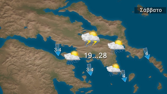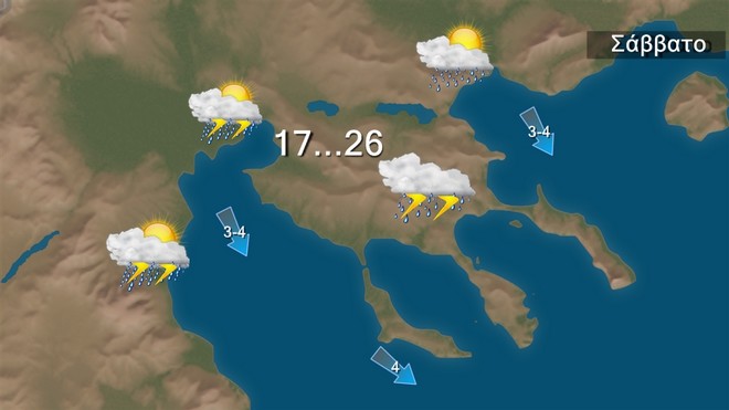 Το Σάββατο προβλέπονται ισχυρές βροχές και καταιγίδες, που θα συνοδεύονται από μεγάλη συχνότητα κεραυνών και κατά τόπους από χαλαζοπτώσεις, σε όλη σχεδόν την ηπειρωτική χώρα κυρίως τις μεσημβρινές και απογευματινές ώρες. Τα φαινόμενα το βράδυ θα εξασθενήσουν και τη νύχτα θα σταματήσουν. Οι άνεμοι θα πνέουν δυτικοί βορειοδυτικοί 3 με 4 και στα νότια πελάγη τοπικά έως 5 μποφόρ. Η θερμοκρασία δεν θα σημειώσει αξιόλογη μεταβολή και θα κυμανθεί σε λίγο χαμηλότερα από τα κανονικά για την εποχή επίπεδα και θα φτάσει στα βόρεια τους 26 βαθμούς στο Ιόνιο και τα υπόλοιπα ηπειρωτικά τους 28 βαθμούς και στα νησιά του Αιγαίου τους 27 με 28 βαθμούς Κελσίου