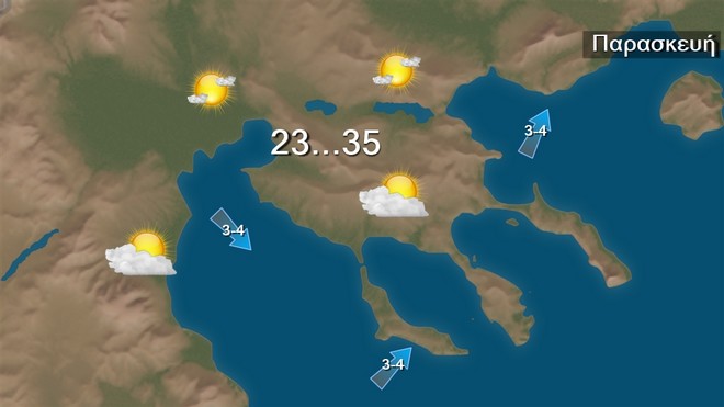 Την Παρασκευή προβλέπεται γενικά αίθριος καιρός, με τοπικές νεφώσεις τις μεσημβρινές και απογευματινές ώρες στα ηπειρωτικά. Οι άνεμοι θα πνέουν από βόρειες διευθύνσεις, στα δυτικά 3 με 5, στα ανατολικά 4 με 6 και στο Αιγαίο κατά τη διάρκεια της ημέρας τοπικά 7 μποφόρ.