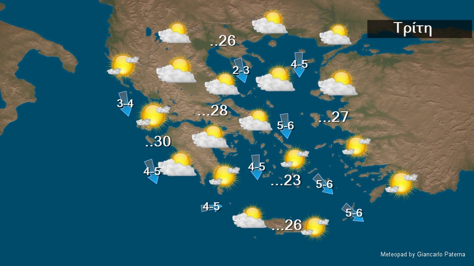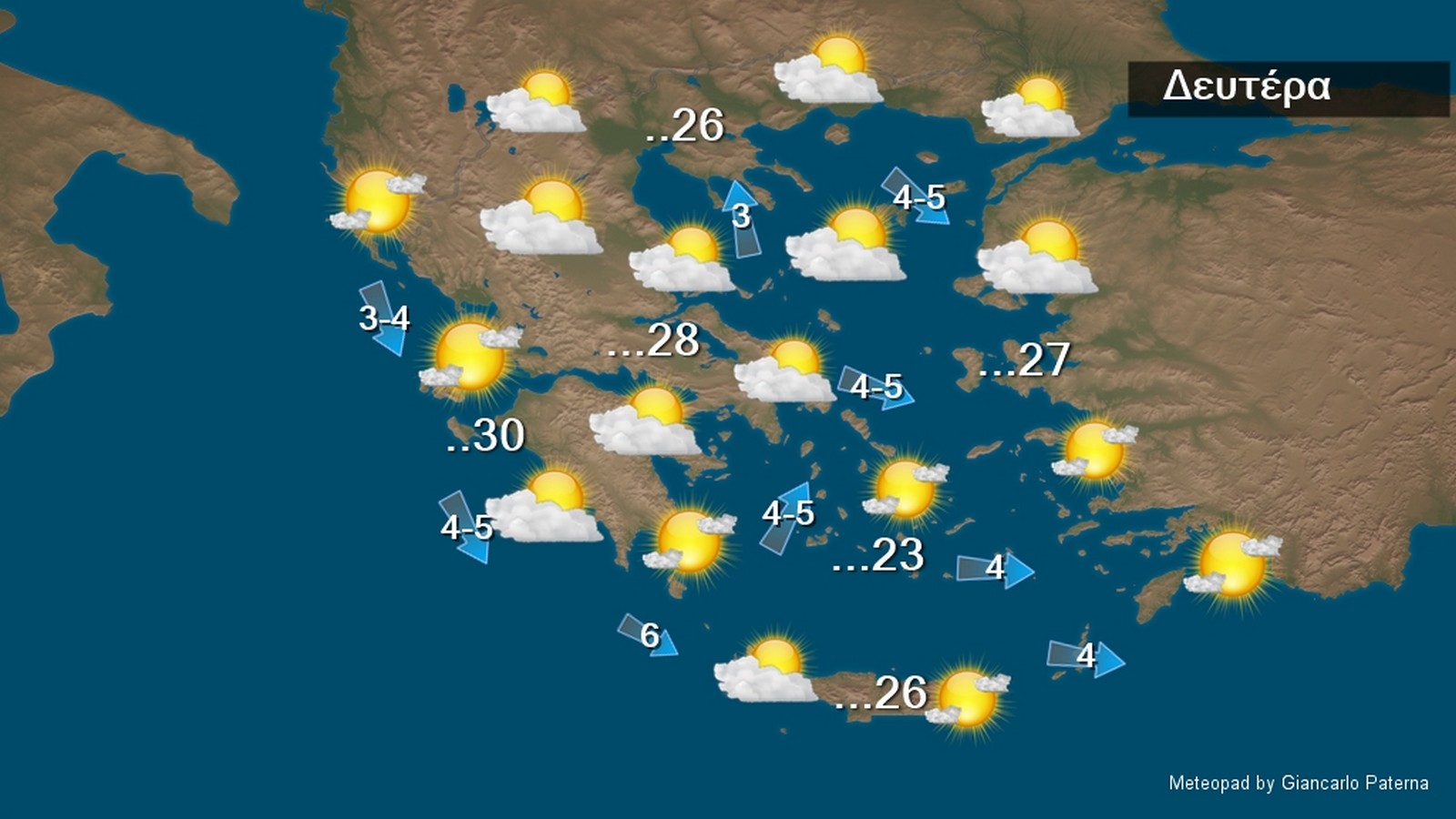 Οι άνεμοι θα πνέουν στα δυτικά νότιοι νοτιοανατολικοί 4 με 5 μποφόρ στρεφόμενοι σταδιακά από τα βόρεια σε βόρειους με την ίδια ένταση. Στα ανατολικά οι άνεμοι θα πνέουν από νότιες διευθύνσεις 4 με 5 και τοπικά στο Αιγαίο 6 μποφόρ. Η θερμοκρασία δε θα σημειώσει αξιόλογη μεταβολή με εξαίρεση στα βορειοδυτικά που θα σημειώσει μικρή πτώση ως προς τις μέγιστες τιμές της και θα φτάσει στις περισσότερες περιοχές τους 26 με 28 βαθμούς Κελσίου.