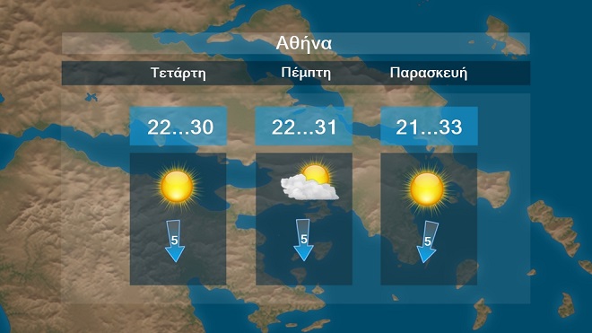 Στην Αθήνα προβλέπεται αίθριος καιρός. Η μέγιστη θερμοκρασία θα κυμαίνεται περί τους 30 με 33 βαθμούς Κελσίου.