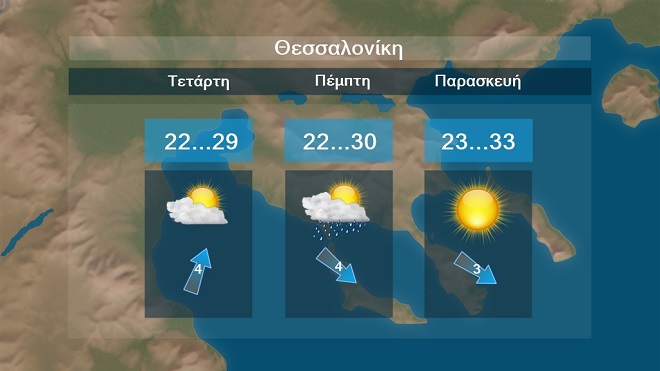 Στη Θεσσαλονίκη προβλέπονται τοπικές νεφώσεις με πιθανή αστάθεια την Πέμπτη . Η θερμοκρασία θα κυμαίνεται περί τους 29 με 33 βαθμούς Κελσίου.