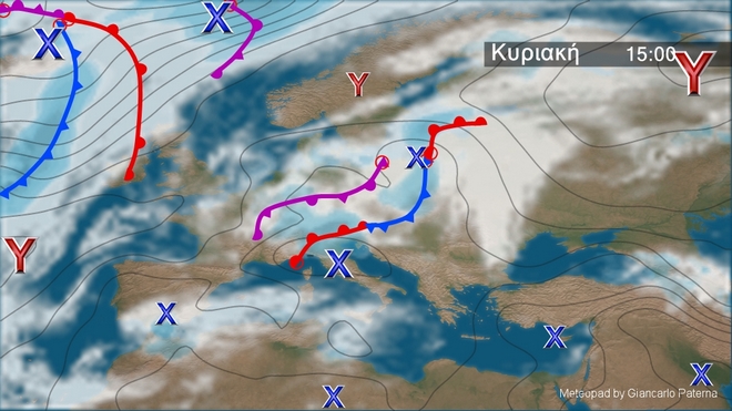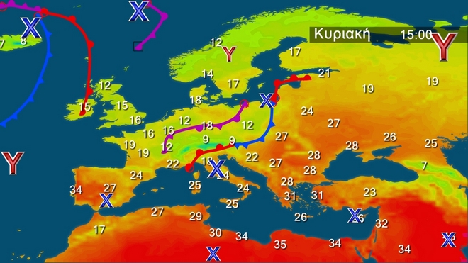 Στον γενικό χάρτη της Ευρώπης διακρίνονται τα χαμηλά που επηρεάζουν την Βορειοδυτική και Κεντρική Ευρώπη, ενώ το σύστημα που βρίσκεται στην περιοχή της Ιταλίας παραμένει σχεδόν στάσιμο.