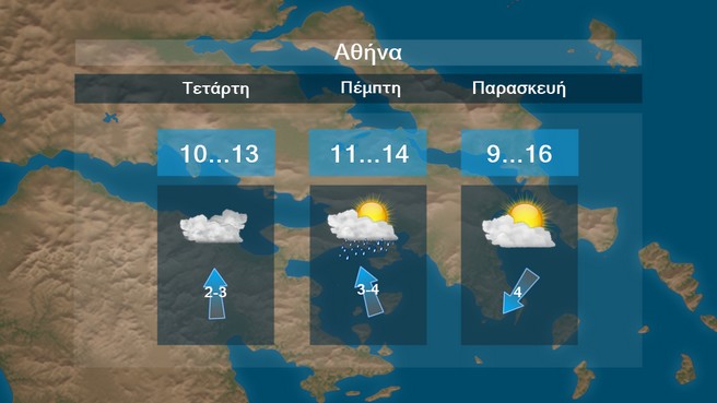 Στη δυτική Ελλάδα προβλέπονται νεφώσεις παροδικά αυξημένες με τοπικές βροχές και σποραδικές καταιγίδες αρχικά στα βόρεια και βαθμιαία και στις υπόλοιπες περιοχές. Στην υπόλοιπη χώρα αραιές νεφώσεις κατά διαστήματα πιο πυκνές. Η ορατότητα τις πρωινές και βραδινές ώρες θα είναι τοπικά περιορισμένη κυρίως στα ηπειρωτικά και θα σχηματιστούν ομίχλες. Οι άνεμοι θα πνέουν από νότιες διευθύνσεις 3 με 5 και στο Ιόνιο τοπικά 6 μποφόρ. Στο νοτιοανατολικό Αιγαίο τις πρωινές ώρες θα πνέουν βορειοδυτικοί 4 με 5 μποφόρ. Η θερμοκρασία θα σημειώσει μικρή άνοδο. Θα φτάσει στα βόρεια τους 13 με 14 βαθμούς, στα υπόλοιπα ηπειρωτικά τους 15 με 16 και στη νησιωτική χώρα τους 16 με 17 βαθμούς Κελσίου.