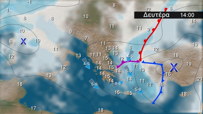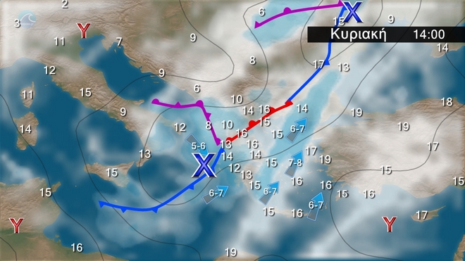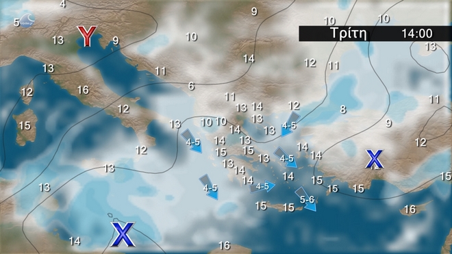 Στη Θράκη, τα νησιά του Αιγαίου και την Κρήτη νεφώσεις με βροχές και σποραδικές καταιγίδες που πιθανώς κατά τόπους μέχρι το απόγευμα να είναι ισχυρές και λίγα χιόνια στα ορεινά της Θράκης. Στις υπόλοιπες περιοχές λίγες νεφώσεις παροδικά αυξημένες με πρόσκαιρες τοπικές βροχές και βαθμιαία βελτίωση. Οι άνεμοι θα πνέουν νότιοι νοτιοδυτικοί 3 με 5 και στα πελάγη τοπικά 6 μποφόρ. Βαθμιαία από τα δυτικά θα στραφούν σε βόρειους βορειοδυτικούς 4 με 6 μποφόρ. Η θερμοκρασία θα σημειώσει πτώση στα ανατολικά και νότια.