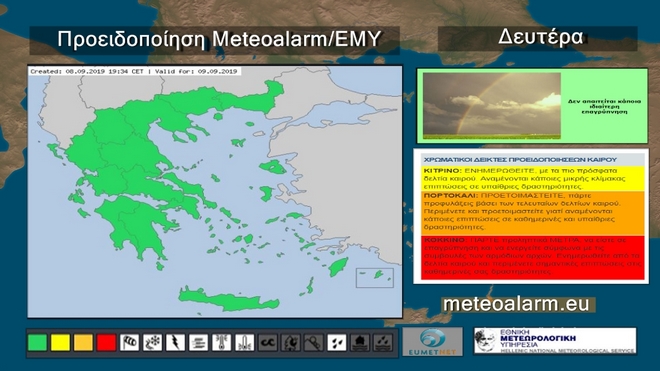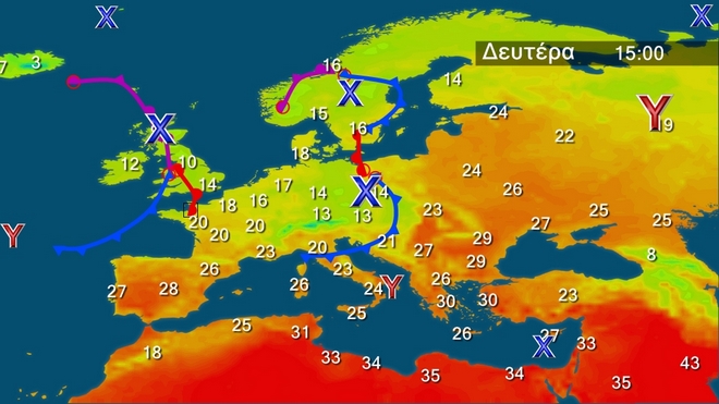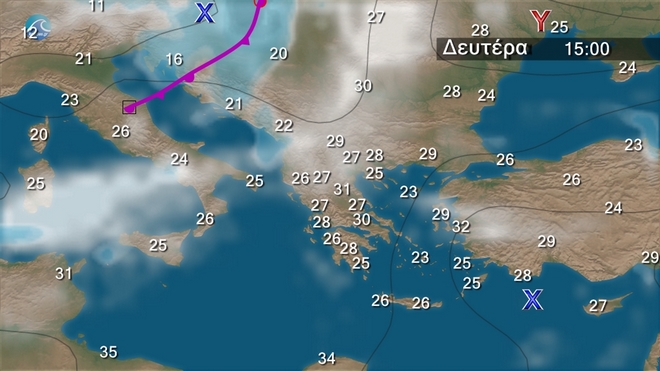 Τη Δευτέρα στα δυτικά και τη Μακεδονία προβλέπονται λίγες νεφώσεις παροδικά αυξημένες κυρίως τις μεσημβρινές και απογευματινές ώρες, με τοπικούς όμβρους ή μεμονωμένες καταιγίδες κυρίως στα ηπειρωτικά ορεινά. Στην υπόλοιπη χώρα γενικά αίθριος, με παροδικές νεφώσεις τις μεσημβρινές και απογευματινές ώρες στα ηπειρωτικά και πρόσκαιρους όμβρους στα ορεινά. Η θερμοκρασία δεν θα σημειώσει αξιόλογη μεταβολή και θα φτάσει στα δυτικά τους 32 βαθμούς στα υπόλοιπα ηπειρωτικά τους 32 με 33, στις Κυκλάδες τους 27, στη νότια Κρήτη τους 30 και στο Ανατολικό Αιγαίο τους 31 βαθμούς Κελσίου.