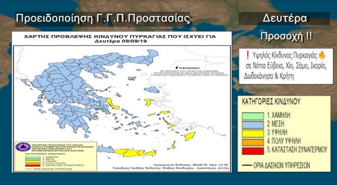 Από πλευράς επικινδυνότητας πυρκαγιών θα έχουμε Υψηλό Κίνδυνο Πυρκαγιάς σε Νότια Εύβοια, Χίο, Σάμο, Ικαρία, Δωδεκάνησα & Κρήτη σύμφωνα με την πρόβλεψη της Γενικής Γραμματείας Πολιτικής Προστασίας.
