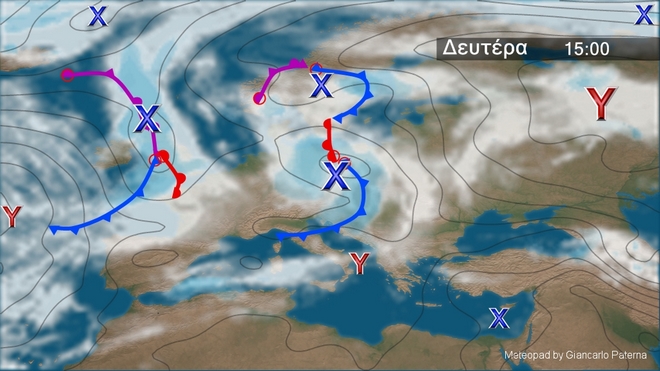 Στον γενικό χάρτη της Ευρώπης διακρίνονται τα χαμηλά που επηρεάζουν την Βορειοδυτική και Κεντρική Ευρώπη ενώ το σύστημα που βρίσκεται στην περιοχή της Ιταλίας παραμένει σχεδόν στάσιμο.