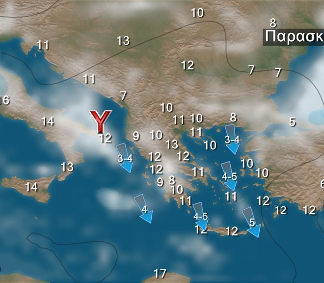 Στα νησιά του Ιονίου, την Ήπειρο και τη δυτική Στερεά θα υπάρχουν λίγες νεφώσεις. Στην υπόλοιπη χώρα προβλέπονται νεφώσεις με τοπικές βροχές ή χιονόνερο, χιόνια στα ορεινά-ημιορεινά, καθώς και σε περιοχές της βόρειας χώρας, της Θεσσαλίας, της ανατολικής Στερεάς και της Εύβοιας με χαμηλότερο υψόμετρο. Μεμονωμένες καταιγίδες θα εκδηλωθούν στο Αιγαίο. Τα φαινόμενα στα βόρεια γρήγορα θα σταματήσουν, βαθμιαία θα περιοριστούν στα ανατολικά και τα νότια και μέχρι το βράδυ στις Κυκλάδες και την Κρήτη. Οι άνεμοι θα πνέουν βόρειοι βορειοανατολικοί 5 με 6 μποφόρ με σταδιακή εξασθένηση στα βόρεια. Η θερμοκρασία θα κυμανθεί σε επίπεδα χαμηλότερα από τα κανονικά για την εποχή. Παγετός θα σημειωθεί στα ηπειρωτικά τις πρωινές και βραδινές ώρες, στα βόρεια τοπικά ισχυρός.