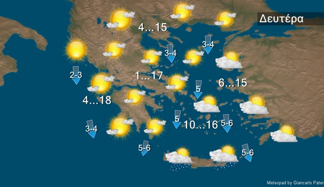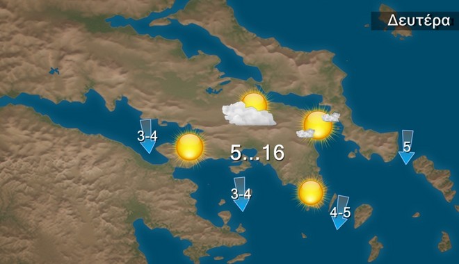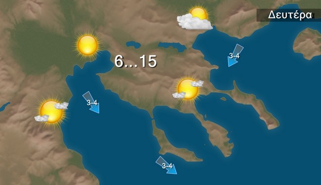 Τη Δευτέρα προβλέπεται γενικά αίθριος καιρός στο μεγαλύτερο μέρος της χώρας, ενώ παροδικές νεφώσεις θα υπάρχουν στη νότια νησιωτική χώρα, με τοπικές βροχές στα Δωδεκάνησα και την Κρήτη όπου τις πρώτες πρωινές ώρες θα σημειωθούν μεμονωμένες καταιγίδες. Βαθμιαία από το μεσημέρι ο καιρός θα βελτιωθεί. Η ορατότητα στα ηπειρωτικά τις πρωινές και βραδινές ώρες θα είναι κατά τόπους περιορισμένη και στα βόρεια είναι πιθανό να σχηματιστούν τοπικές ομίχλες. Οι άνεμοι στα δυτικά και τα βόρεια θα είναι μεταβλητοί 3 με 4 μποφόρ, ενώ στις υπόλοιπες περιοχές θα πνέουν από βόρειες διευθύνσεις 4 με 5 και τοπικά στο Αιγαίο έως 6 μποφόρ.
