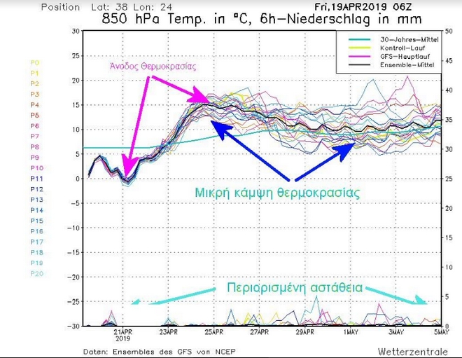 Παρατηρείστε όμως πόσο πολύ ανοίγουν οι γραμμές μετά τις 24 του μηνός, που σημαίνει ότι ημέρα με την ημέρα η προβλεψιμότητα ελαττώνεται και οι τιμές αποκλίνουν αρκετά από τον μέσο όρο. Πάντως οι θερμοκρασίες τείνουν να βρίσκονται το Πάσχα περί τους 22 περίπου βαθμούς.