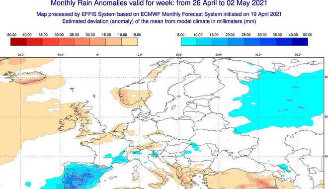 Πάντως στη συνολική εικόνα του καιρού από πλευράς υετού παρατηρούμε οτι όλη τη Μεγάλη εβδομάδα , με βάση τα δεδομένα του ECMWF, οι προβλεπόμενες τιμές βρίσκονται κάτω από τα κανονικά επίπεδα και πρακτικά δεν προβλέπονται βροχές