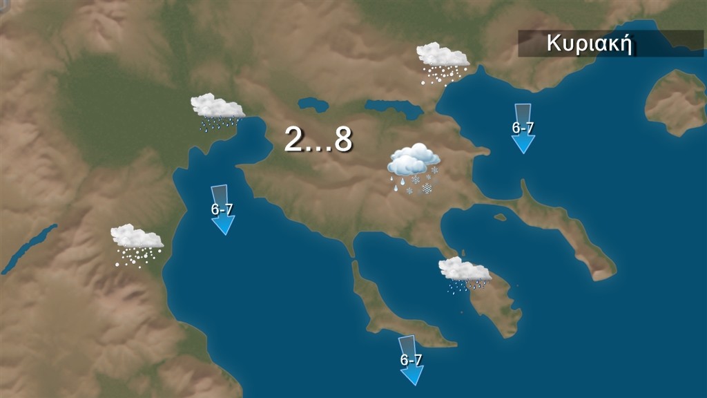 Την Κυριακή προβλέπονται νεφώσεις με τοπικές βροχές αρχικά στα δυτικά και τα βόρεια και σταδιακά στην υπόλοιπη χώρα. Σποραδικές καταιγίδες θα εκδηλωθούν στα θαλάσσια – παραθαλάσσια. Χιονοπτώσεις θα σημειωθούν σε όλα τα ορεινά, στα ημιορεινά της ηπειρωτικής χώρας και από τις απογευματινές ώρες στα νησιά του βορείου και ανατολικού Αιγαίου, την Εύβοια και σε πεδινές περιοχές της Μακεδονίας, της Θράκης και της Θεσσαλίας. Οι χιονοπτώσεις θα είναι κατά τόπους πυκνές από τις βραδινές ώρες στην ανατολική Στερεά, την Εύβοια (ενδεικτικό υψόμετρο 200-400 μέτρα), καθώς και στα ημιορεινά της ανατολικής Πελοποννήσου. Οι άνεμοι στα δυτικά, κεντρικά και βόρεια θα πνέουν από βόρειες διευθύνσεις 5 με 7 μποφόρ που θα ενισχυθούν βαθμιαία στα πελάγη στα 7 με 8 και τοπικά 9 μποφόρ. Στα νότια από δυτικές διευθύνσεις 4 με 6 μποφόρ από το απόγευμα θα στραφούν σε βόρειους και θα ενισχυθούν. Η θερμοκρασία στα βόρεια δεν θα ξεπεράσει τους 9 βαθμούς , στα υπόλοιπα ηπειρωτικά και το Ιόνιο θα φτάσει τους 10 με 14 βαθμούς και στο Αιγαίο τους 14 με 15 βαθμούς Κελσίου.