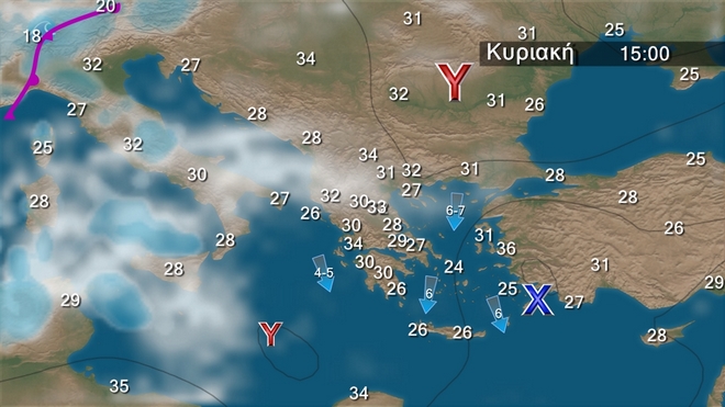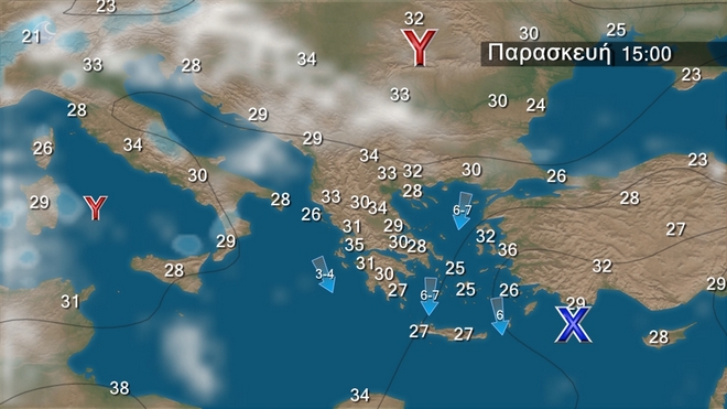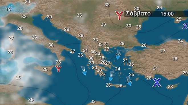 Γενικά αίθριος καιρός με πρόσκαιρες νεφώσεις τις πρωινές ώρες στις Κυκλάδες και την Κρήτη. Τις μεσημβρινές και απογευματινές ώρες στα δυτικά και βόρεια ηπειρωτικά θα αναπτυχθούν τοπικές νεφώσεις. Οι άνεμοι θα πνέουν από βόρειες διευθύνσεις στα δυτικά 3 με 5, στα ανατολικά 4 με 6 και πρόσκαιρα στο Αιγαίο τοπικά 7 μποφόρ. Η θερμοκρασία δεν θα σημειώσει αξιόλογη μεταβολή.