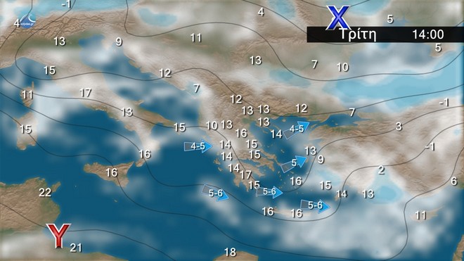 Στα δυτικά, τα νησιά του ανατολικού Αιγαίου, τα Δωδεκάνησα και πρόσκαιρα στην ανατολική Μακεδονία, τη Θράκη, τις Κυκλάδες και την Κρήτη νεφώσεις παροδικά αυξημένες με τοπικές βροχές και στα Δωδεκάνησα πιθανόν καταιγίδες με βαθμιαία βελτίωση από τα δυτικά. Στα υπόλοιπα γενικά αίθριος καιρός. Οι άνεμοι θα πνέουν από δυτικές διευθύνσεις 4 με 6 και στα νότια πελάγη τοπικά 7 μποφόρ. Η θερμοκρασία θα σημειώσει περαιτέρω άνοδο.