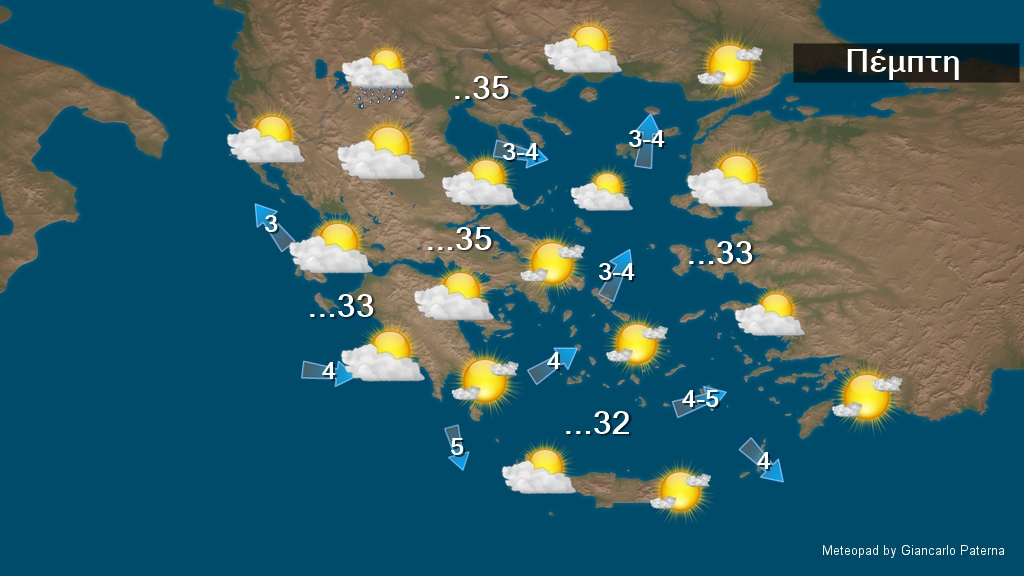 Στα δυτικά νεφώσεις τοπικά αυξημένες με σποραδικές βροχές και πιθανόν μεμονωμένες καταιγίδες και γρήγορη βελτίωση. Στην υπόλοιπη χώρα αραιές νεφώσεις κατά περιόδους πυκνότερες στα ηπειρωτικά τις απογευματινές ώρες.Οι άνεμοι θα πνέουν από δυτικές διευθύνσεις 3 έως 5 και τοπικά στα κεντρικά και νότια έως 6 μποφόρ. Η θερμοκρασία δεν θα σημειώσει αξιόλογη μεταβολή. Στα δυτικά και τα βόρεια ηπειρωτικά θα φτάσει τους 29 με 32 βαθμούς και στα υπόλοιπα ηπειρωτικά τους 35 με 36 βαθμούς Κελσίου. Στη νησιωτική χώρα θα φτάσει τους 30 με 33 και κατά τόπους στην Κρήτη τους 34 βαθμούς Κελσίου.