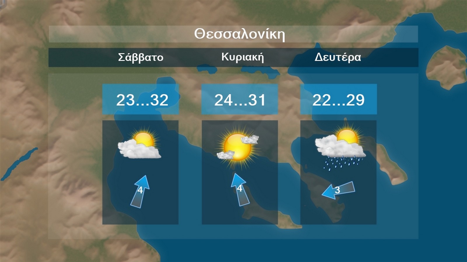 Γενικά αίθριος καιρός με πρόσκαιρες νεφώσεις τις μεσημβρινές και απογευματινές ώρες στα ηπειρωτικά ορεινά. Οι άνεμοι θα πνέουν στα δυτικά νότιοι νοτιοδυτικοί 3 με 4 μποφόρ, στα ανατολικά από βόρειες διευθύνσεις 3 με 4 και στο ανατολικό Αιγαίο τοπικά 5 με 6 μποφόρ. Η θερμοκρασία θα σημειώσει μικρή άνοδο και θα κυμανθεί σε επίπεδα υψηλότερα από τα κανονικά για την εποχή κατά 3 με 5 βαθμούς, φτάνοντας τους 30 με 34 και τοπικά στα ηπειρωτικά τους 35 με 36 βαθμούς Κελσίου.