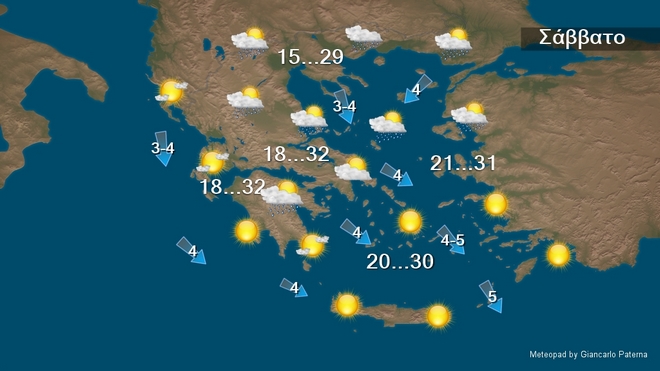 Το Σάββατο στην κεντρική και ανατολική Μακεδονία, την ανατολική Θεσσαλία, τις Σποράδες,το βόρειο Αιγαίο και τη Θράκη προβλέπεται άστατος καιρός με τοπικές βροχές και σποραδικές καταιγίδες. Στην υπόλοιπη χώρα λίγες νεφώσεις παροδικά αυξημένες κυρίως στα ηπειρωτικά Οι άνεμοι θα πνέουν βόρειοι βορειοδυτικοί 3 με 5 μποφόρ.