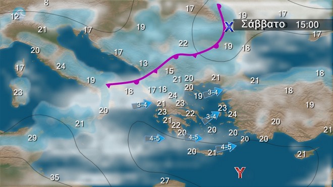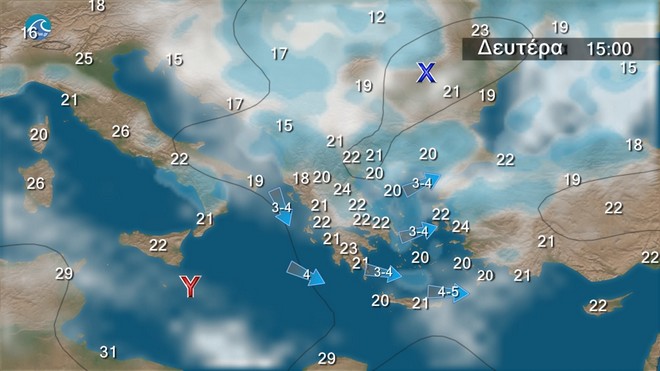 Στην ανατολική Μακεδονία, τη Θράκη και τις μεσημβρινές και απογευματινές ώρες και στα υπόλοιπα ηπειρωτικά, νεφώσεις με τοπικές βροχές και πιθανώς μεμονωμένες καταιγίδες. Στη νησιωτική χώρα λίγες νεφώσεις, πρόσκαιρα αυξημένες κυρίως στα ανατολικά όπου θα εκδηλωθούν σποραδικές βροχές. Οι άνεμοι θα πνέουν, στα δυτικά βορειοδυτικοί 4 με 5 και στα υπόλοιπα από νότιες διευθύνσεις 3 με 5 μποφόρ. Η θερμοκρασία θα σημειώσει μικρή άνοδο.