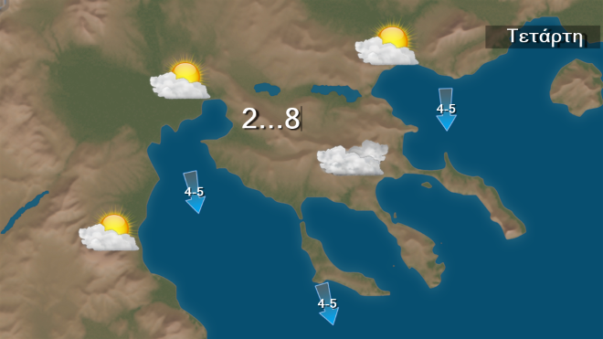 Σήμερα Τρίτη Κατά τόπους ισχυρές βροχές και καταιγίδες θα εκδηλωθούν στη Θεσσαλία, τη δυτική και κεντρική Στερεά, την ανατολική Πελοπόννησο και την Κρήτη. Κατά τόπους πυκνές χιονοπτώσεις θα σημειωθούν στα ηπειρωτικά ορεινά, στα ημιορεινά της Ηπείρου, της Θεσσαλίας, της δυτικής και κεντρικής Στερεάς και σε περιοχές με χαμηλότερο υψόμετρο της δυτικής και κεντρικής Μακεδονίας. Οι άνεμοι θα πνέουν από βόρειες διευθύνσεις 3 με 5 και τοπικά στο Αιγαίο 6 μποφόρ. Η θερμοκρασία θα παραμείνει σε σχετικά χαμηλά επίπεδα φθάνοντας στα βόρεια τους 07 με 09 βαθμούς, στα κεντρικά τους 10 με 12 βαθμούς και στις υπόλοιπες περιοχές τους 13 με 14 βαθμούς Κελσίου. Παγετός θα σημειωθεί κατά τόπους στα ηπειρωτικά τις πρωινές και βραδινές ώρες, που θα είναι τοπικά ισχυρός στα βόρεια.