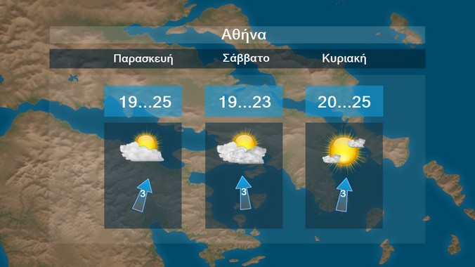 Στην Αθήνα προβλέπονται τοπικές νεφώσεις. Η θερμοκρασία θα έχει μέγιστες τιμές περί τους 23 με 25 βαθμούς Κελσίου.