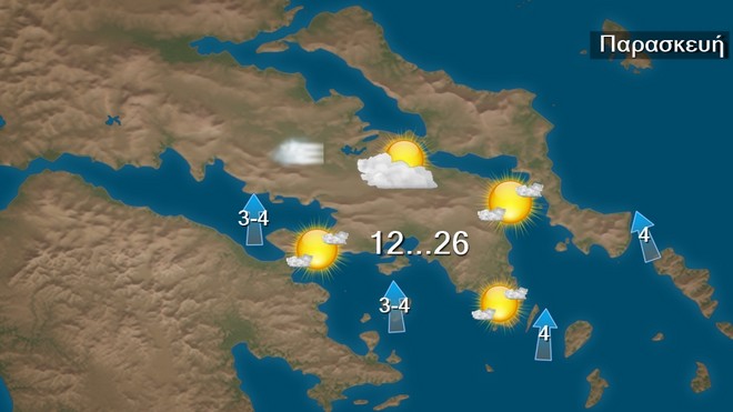 Σήμερα Παρασκευή προβλέπονται αραιές νεφώσεις, κατά περιόδους πιο πυκνές Η ορατότητα τις πρωινές και βραδινές ώρες θα είναι τοπικά περιορισμένη στα ανατολικά και τα βόρεια, όπου θα σχηματιστούν κατά τόπους ομίχλες. Ευνοείται η μεταφορά αφρικανικής σκόνης στα δυτικά. Οι άνεμοι θα πνέουν νότιοι ΄στο Αιγαίο μέχρι μέτριοι ενώ στο Ιόνιο θα φτάσουν 6 τοπικά 7 μποφόρ. Η θερμοκρασία στα βόρεια θα φτάσει τους 22 με 23 βαθμούς Κελσίου, στα υπόλοιπα ηπειρωτικά και τα νησιά τους 24 με 26 βαθμούς και στην Κρήτη κατά τόπους τους 27 βαθμούς Κελσίου.