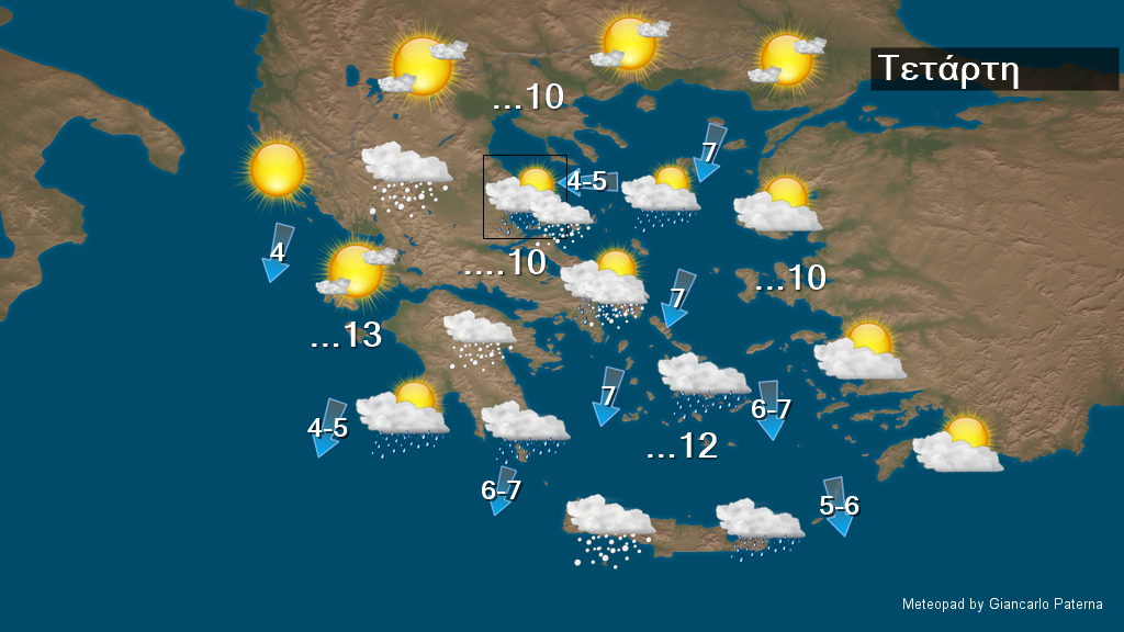 Στα δυτικά και τα βόρεια προβλέπονται λίγες τοπικές νεφώσεις. Στην υπόλοιπη χώρα νεφώσεις κατά διαστήματα αυξημένες με τοπικές βροχές ή χιονόνερο. Χιόνια θα πέσουν στα ορεινά και τα ημιορεινά και πιθανώς πρόσκαιρα σε περιοχές με χαμηλότερο υψόμετρο. Οι χιονοπτώσεις θα έχουν ασθενή έως μέτρια ένταση. Σταδιακά τα φαινόμενα από τα βόρεια θα εξασθενήσουν. Οι άνεμοι θα πνέουν από βόρειες διευθύνσεις, στα δυτικά 4 με 6 και στα ανατολικά 6 με 8 μποφόρ με βαθμιαία εξασθένηση. Η θερμοκρασία θα σημειώσει μικρή άνοδο ως προς τις μέγιστες τιμές.