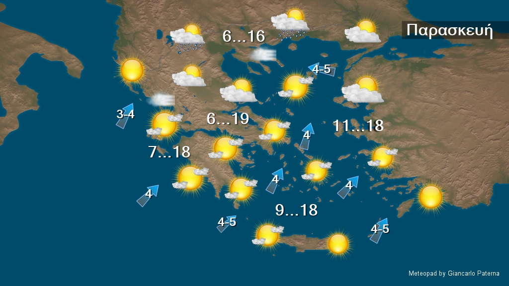 Σήμερα Παρασκευή προβλέπονται τοπικές νεφώσεις και αυξημένη υγρασία. Λίγες ασθενείς τοπικές βροχές θα εκδηλωθούν τις πρωινές ώρες, κυρίως στην κεντρική Μακεδονία και την ανατολική Θεσσαλία. Η ορατότητα τις πρωινές και βραδινές ώρες θα είναι τοπικά περιορισμένη και θα σχηματιστούν ομίχλες. Οι άνεμοι θα είναι μεταβλητοί ασθενείς και μόνο στα βορειοανατολικά μέχρι το μεσημέρι θα πνέουν ανατολικοί βορειοανατολικοί με ένταση έως 5 μποφόρ. Από το απόγευμα βαθμιαία θα επικρατήσουν νότιοι άνεμοι 3 με 4 και το βράδυ στα πελάγη τοπικά 5 μποφόρ. Η θερμοκρασία θα σημειώσει μικρή πτώση στα βόρεια, όπου δεν θα ξεπεράσει τους 14 με 16 βαθμούς. Στην υπόλοιπη χώρα θα κυμανθεί σε υψηλές τιμές για την εποχή και θα φθάσει τους 17 με 19 βαθμούς Κελσίου.