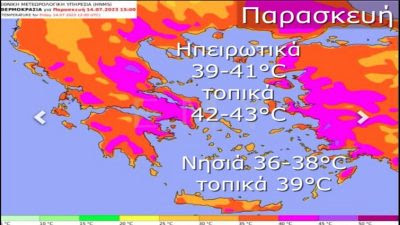 Την Παρασκευή η θερμοκρασία θα σημειώσει μικρή περαιτέρω άνοδο και θα φτάσει σε πολύ υψηλά επίπεδα, στα ηπειρωτικά τους 39 με 41 βαθμούς και κατά τόπους στο εσωτερικό της Θεσσαλίας, της Στερεάς και της Πελοποννήσου τους 42 και πιθανόν τους 43 βαθμούς Κελσίου. Στη νησιωτική χώρα θα φτάσει τους 36 με 38 και τοπικά τους 39 βαθμούς Κελσίου.