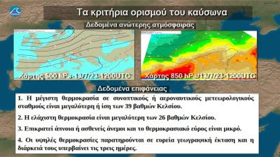Τη Δευτέρα θα αποφασίσουμε στην ΕΜΥ, πότε θα δώσουμε τελικώς την επίσημη έναρξη του φαινομένου, που σύμφωνα με τα σημερινά δεδομένα, προκρίνεται να γίνει την ερχόμενη Τετάρτη. Όπως θα δείτε και παρακάτω, παρότι κινούμαστε στο 38 με 39 για την Τετάρτη, δεν θα παραμείνουμε στο τυπικό περιμένοντας την Πέμπτη (που πληροί όλα τα παραπάνω κριτήρια), αλλά θα γίνει πρόταση να εκδοθεί το σχετικό έκτακτο δελτίο λίγο νωρίτερα την Τετάρτη . Η κορύφωση του καύσωνα ως προς τις μέγιστες θερμοκρασίες δείχνει να έρχεται την Παρασκευή με τάση για μικρή υποχώρηση το Σαββατοκύριακο . Δεν ξεχνάμε όμως ότι ο καύσωνας είναι “ύπουλος “, δεν φαίνεται σαν τις βροχές και τις καταιγίδες και οι μεγάλες δυσκολίες έρχονται τις βραδυνές ώρες, ειδικά τότε όπου ο υδράργυρος δεν πέφτει κάτω από τους 30 βαθμούς μέσα στα μεγάλα αστικά κέντρα. Εν πάσει περιπτώσει ο συγκεκριμένος καύσωνας φαίνεται να έχει μεγάλη διάρκεια και θα κρατήσει μάλλον μέχρι και το τέλος της εβδομάδας. Μερα με τη μέρα θα αναθεωρούμε τα ορια ανάλογα με τα δεδομένα μας.