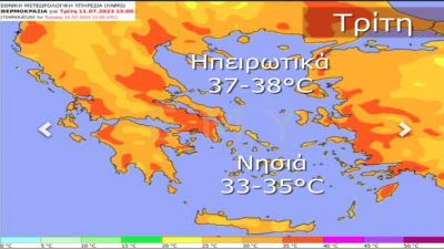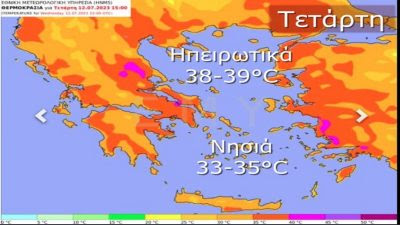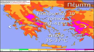 Την Πέμπτη πλέον σε όλα τα ηπειρωτικά θα έχουμε 37 με 39 βαθμούς και κατά τόπους στο εσωτερικό της Θεσσαλίας και της Στερεάς τους 40 με 41 βαθμούς Κελσίου. Στη νησιωτική χώρα ο υδράργυρος θα φτάσει τους 35 με 37 βαθμούς Κελσίου.