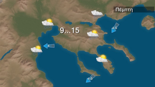Με τοπικές νεφώσεις θα κυλήσει ο καιρός την Πέμπτη στη χώρα μας και στα ανατολικά και νότια θα εκδηλωθούν ασθενείς παροδικές βροχές. Η θερμοκρασία θα πέσει κατά 3 με 4 βαθμούς λόγω της επικράτησης ισχυρών βοριάδων που τοπικά στο Αιγαίο θα φτάσουν τα 7 με 8 μπ.