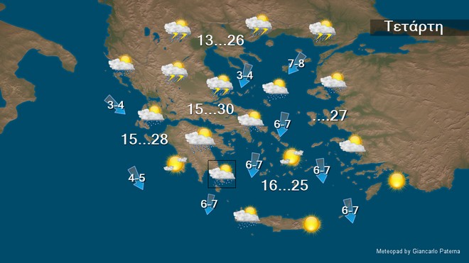 Την Τετάρτη προβλέπεται επιδείνωση του καιρού στη δυτική, κεντρική και βόρεια χώρα από το μεσημέρι με κύρια χαρακτηριστικά τις κατά τόπους ισχυρές βροχές και καταιγίδες, που δεν αποκλείεται να συνοδεύονται από χαλαζοπτώσεις, τους ισχυρούς ανέμους και την αισθητή πτώση της θερμοκρασίας. Κατά τόπους ισχυρές βροχές και καταιγίδες θα εκδηλωθούν από τις προμεσημβρινές ώρες στην ανατολική Μακεδονία και τη Θράκη και βαθμιαία στην κεντρική, τη δυτική Μακεδονία και τα νησιά του βόρειου και του ανατολικού Αιγαίου.
