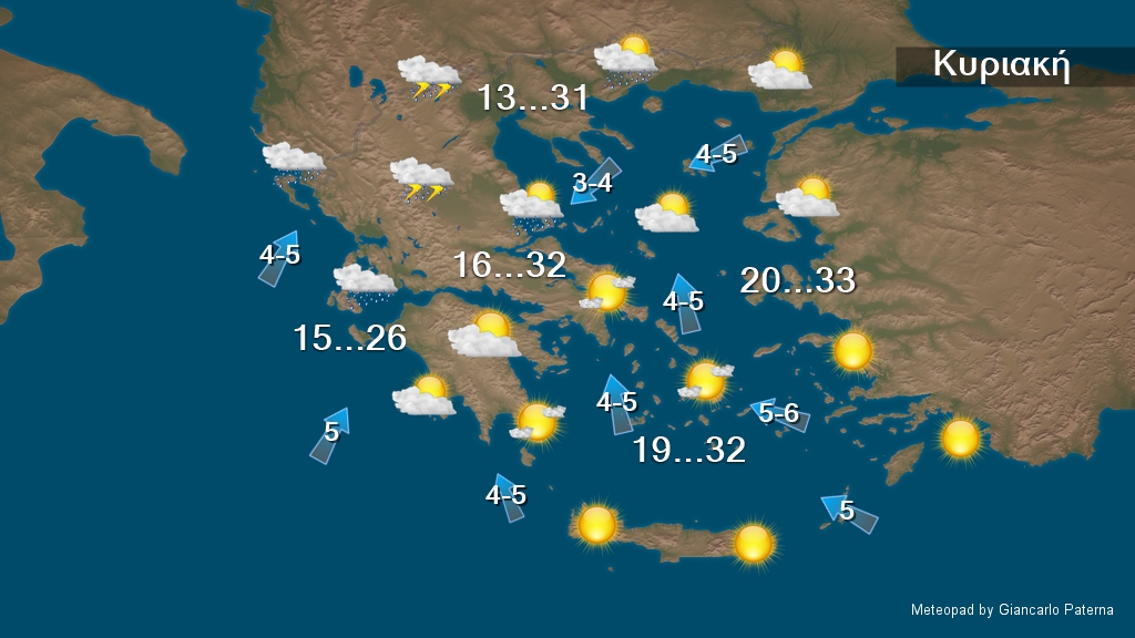 Οι άνεμοι στα δυτικά θα πνέουν νότιοι νοτιοδυτικοί 4 με 5, στα ανατολικά νότιοι νοτιοανατολικοί 4 με 6 μποφόρ που από το βράδυ θα στραφούν σε δυτικούς νοτιοδυτικούς με την ίδια ένταση. Η θερμοκρασία θα σημειώσει πτώση κυρίως στη δυτική Ελλάδα, όπου δεν θα ξεπεράσει τους 25 με 26 βαθμούς, στα υπόλοιπα ηπειρωτικά και την ανατολική νησιωτική χώρα θα φθάσει τους 31 με 33 βαθμούς Κελσίου.