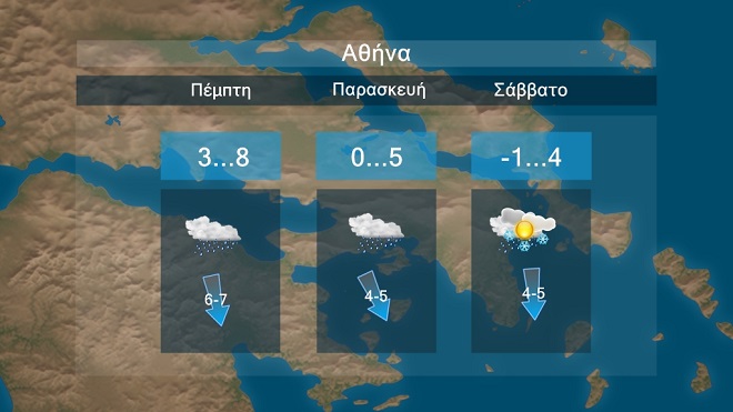 Στην Αττική προβλέπονται νεφώσεις με βροχές η καταιγίδες και ασθενείς χιονοπτώσεις που το βράδυ θα ενταθούν Οι άνεμοι θα πνέουν από ανατολικές διευθύνσεις 4 με 6 μπ με τάση ενίσχυσης και η θερμοκρασία το μεσημέρι θα φτάσει τους 10 βαθμούς Κελσίου