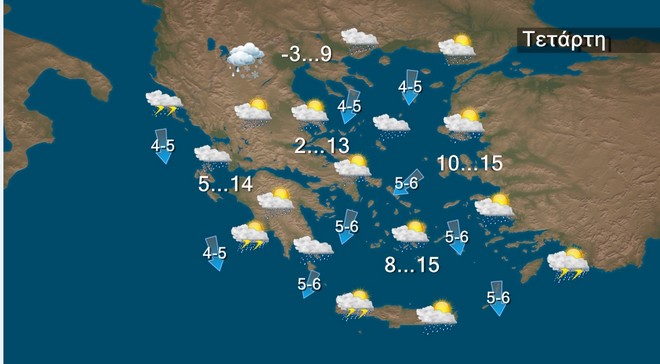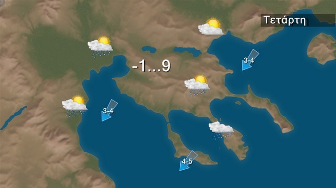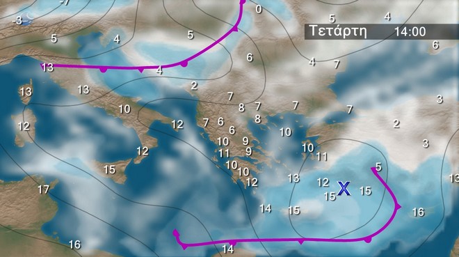 Στον χάρτη της Βαλκανικής που ακολουθεί διακρίνεται καλύτερα το σύστημα το οποίο μα επηρέασε και έχει κινηθεί ανατολικά ενώ η διαταραχή που βρίσκεται στα βορειοδυτικά Βαλκάνια θα κινηθεί νοτιότερα και θα δημιουργήσει συνθήκες κυκλογέννεσης στον Ελληνικό χώρο με φαινόμενα κυρίως στα βορειοδυτικά . Οι άνεμοι θα πνέουν βόρειοι 4 με 5 και τοπικά 6 μπ Η θερμοκρασία θα φτάσει στα βόρεια τους 9 βαθμούς, στα υπόλοιπα ηπειρωτικά τους 13 με 14 βαθμούς και στα νησιά του Αιγαίου τους 15 βαθμούς Κελσίου.