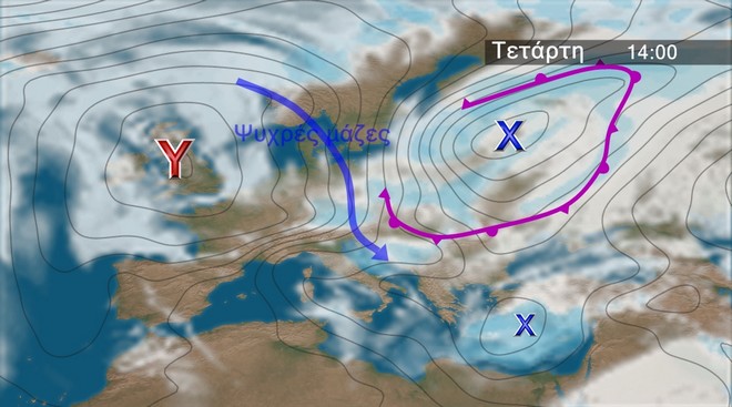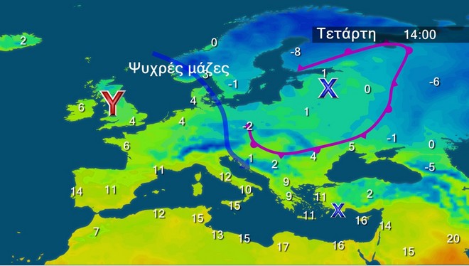 Στον χάρτη των βαρομετρικών συστημάτων της Ευρώπης παρατηρούμε ότι υπάρχει ένας ισχυρός αντικυκλώνας στη Βορειοδυτική Ευρώπη και ένα πολύ ισχυρό βαρομετρικό χαμηλό στα ανατολικά που «πηδαλιουχεί» τις πολύ ψυχρές αέριες μάζες που υπάρχουν βορείως της Αγγλίας να κινηθούν νοτιότερα προς τη χώρα μας. Αυτό φαίνεται καλά στους παρακάτω χάρτες αλλά και στο σχετικό video