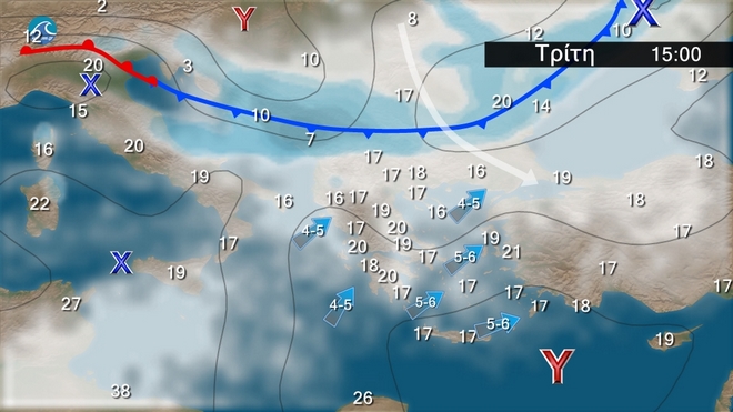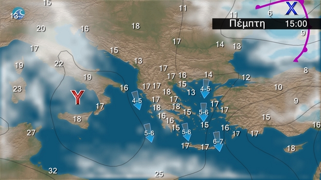 Νεφώσεις παροδικά αυξημένες με τοπικές βροχές αρχικά στα βόρεια και τα κεντρικά και βαθμιαία και στα υπόλοιπα. Σποραδικές καταιγίδες είναι πιθανό να εκδηλωθούν κυρίως στα βορειοανατολικά και την ανατολική νησιωτική χώρα. Σταδιακή βελτίωση από το απόγευμα στα βόρεια και από το βράδυ στα κεντρικά. Οι άνεμοι θα πνέουν στα βόρεια από βόρειες και στα νότια από νότιες διευθύνσεις 5 με 7 και στα πελάγη τοπικά 8 μποφόρ. Βαθμιαία θα στραφούν σε όλη τη χώρα, πλην των Δωδεκανήσων, σε βορείων διευθύνσεων και στο Αιγαίο θα φτάσουν πιθανώς τοπικά τα 9 μποφόρ.